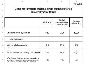 Qo‘ng‘irot tumanida chakana savdo aylanmasi tarkibi (2023 yil yanvar-fevral)