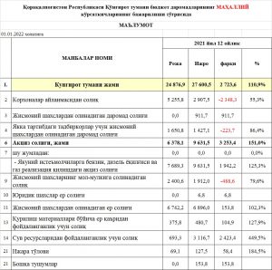 Қорақалпоғистон Республикасы Қўнғирот тумани бюджет дaрoмадларининг маҳаллий кўрсаткичлариниң бажарилиши тўғрисида маълумот